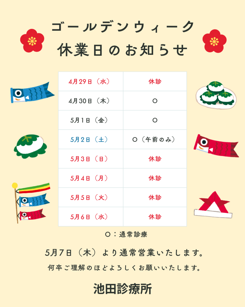 連休前後は混雑が予想されます。お薬の残りをご確認いただき、体調に不安がある場合はお早めにご来院ください。